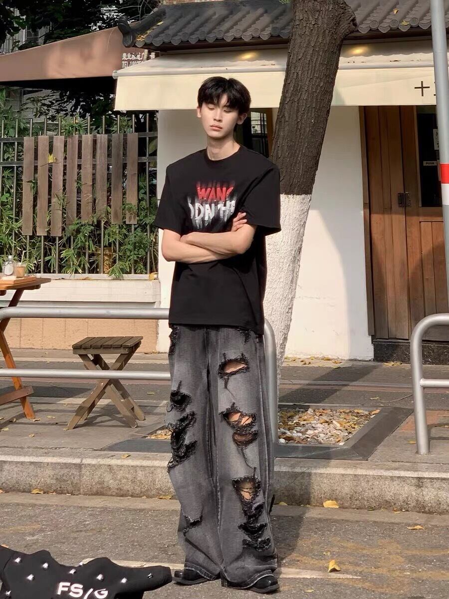 • デザインのポイント: 破れたデザインのジーンズ。老爹靴や厚底靴と相性抜群で、足を長く見せる効果があります。緩いシルエットで、四季を通して着用可能です。