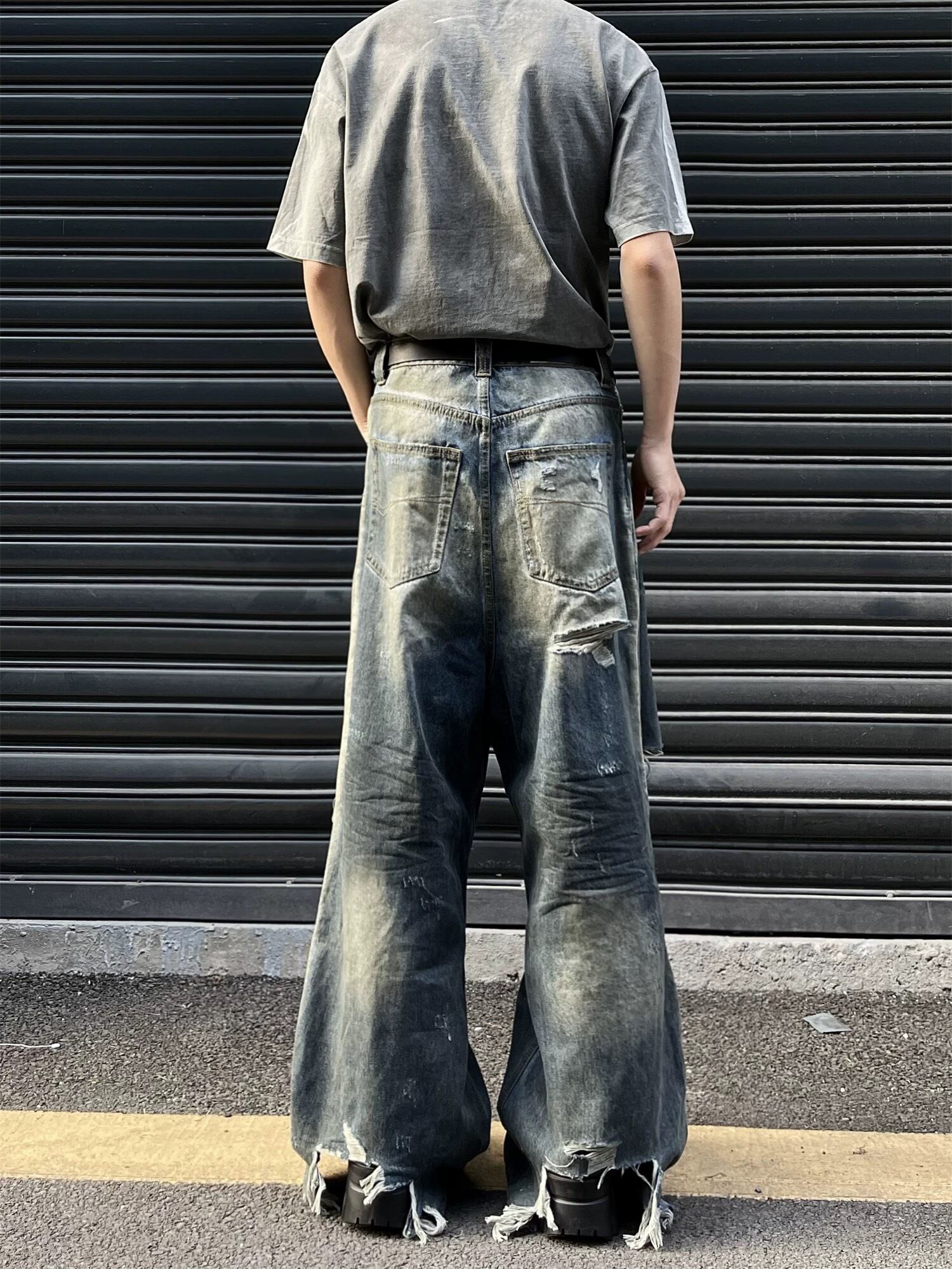 Heavy-Duty Distressed Dirty Wide-Leg Jeans [P113]